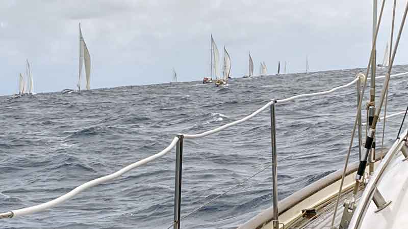 That kept them busy for a while and slowly they’re falling behind.. Some time later, everything is okay. The spinnaker with a German flag in its top is back up and they’re gaining on us again. In the meantime, we have shaken all the reefs and set the staysail as well. The ARC may not be a race, but still… and certainly a German boat we want to make it as difficult as possible. In the end, they do run just a little faster than us and they also steer a few degrees more north. By the end of the morning, they have overtaken us and the race is over.