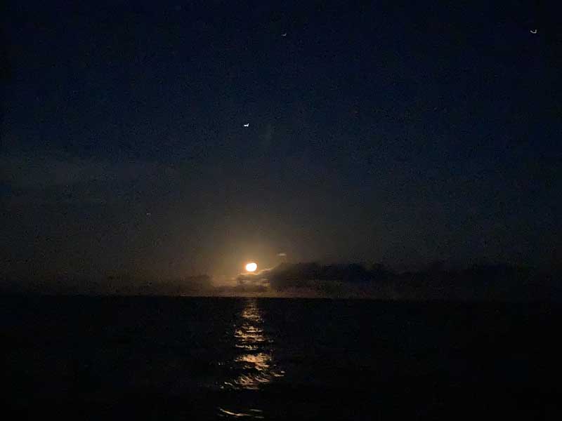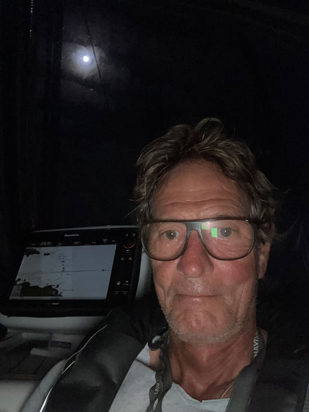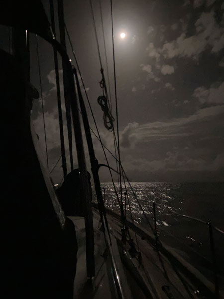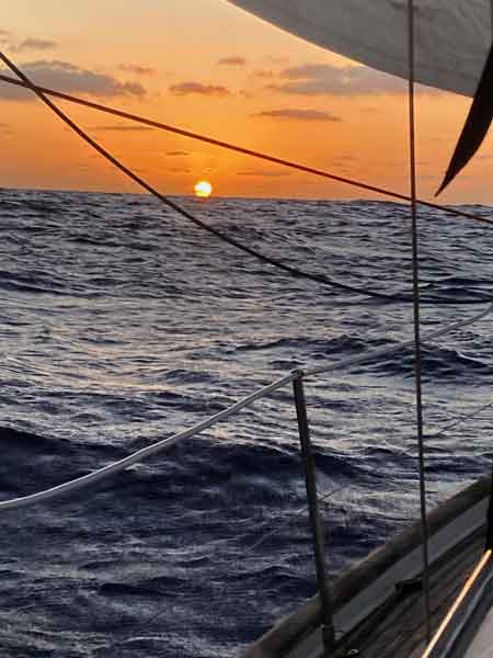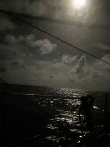 At night, we usually sail on autopilot. Last night I hand steered for a while. Then there was still a bit of light from the waxing moon and I managed to roll the boat a bit less. This was especially nice for Marc and Clare as they had had very little sleep the night before. When the moon sets, it is really dark and you quickly get tired of staring at the instruments all the time. Then it’s time to turn on the autopilot again.