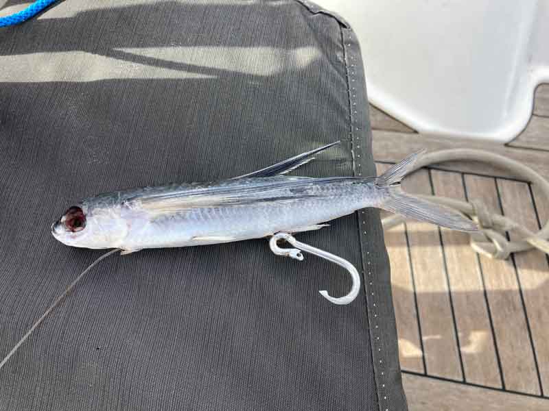 This morning I found 2 flying fish on deck. Baitfriends as we now call them. I threaded the fishing line through our first baitfriend and with the carabiner hook I fabricated, it looked quite serious.