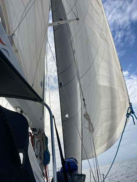 Just before I was to start cooking, Marc saw a large tear in the 2nd genoa…. That didn’t look good, we had to drop it quickly before it ripped completely. Fortunately, we managed to do that very quickly, only the flaking was a bit less successful.