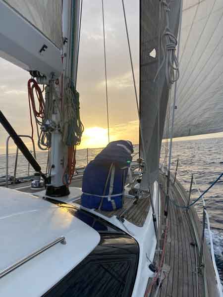 My watch started at 01:00. Time as such plays no role on a crossing like this. Nor do the days of the week. It is a completely different rhythm. You eat when you get hungry, you sleep when you get tired and the days go by with the sun slowly disappearing behind the mainsail at some point. As long as you’re all on the same time, the watches run fine too.