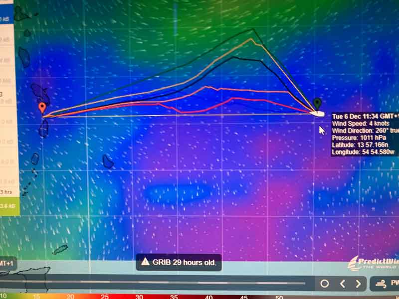 We download the grib files with PredictWind. PredictWind also offers a weather routing option. It then indicates the best route based on the polar (the characteristics of your boat).