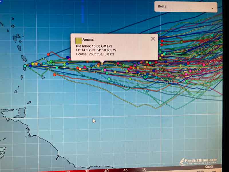 In the afternoon the wind picked up a bit. At first it seemed just the apparent wind but when we set the genoa we were doing a knot faster. When the wind seemed to pick up a little more, we also set the mainsail and even the staysail. We killed the engine and by now we were doing a steady 7kts SOG, with a westerly wind with an almost flat sea and exactly over the rhumb line!! That doesn’t happen very often at this latitude. At least not this time of year. The wind remained very stable and all the time we’ve been sailing with full sails straight to St Lucia. Marc now calculated our ETA at Thursday, December 8th, 16:00 hr.