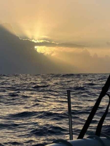 Last night was a great night. We now have both genoa’s out and a 3rd reef in the mainsail. The wind is an estimated 20 kts and the sea state is more moderate. The wind has veered a bit and we are now heading 220 COG.