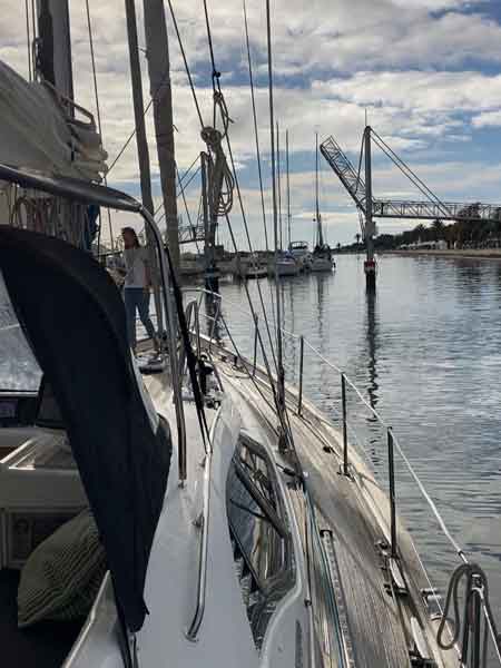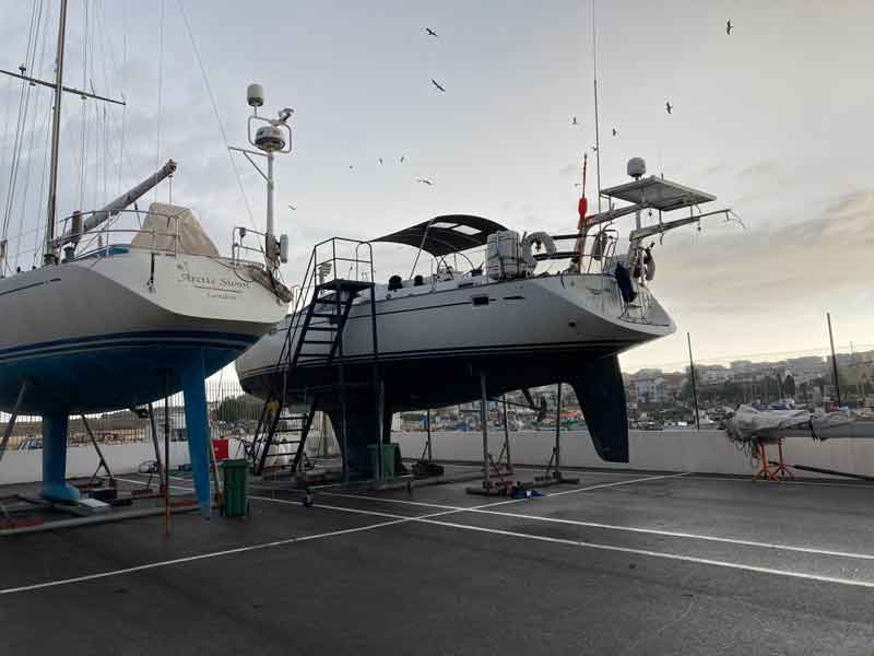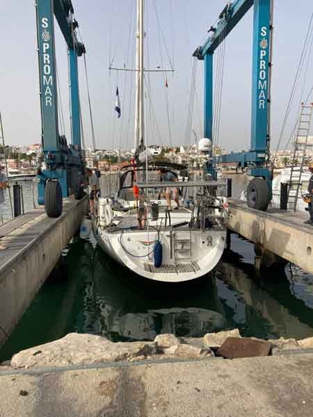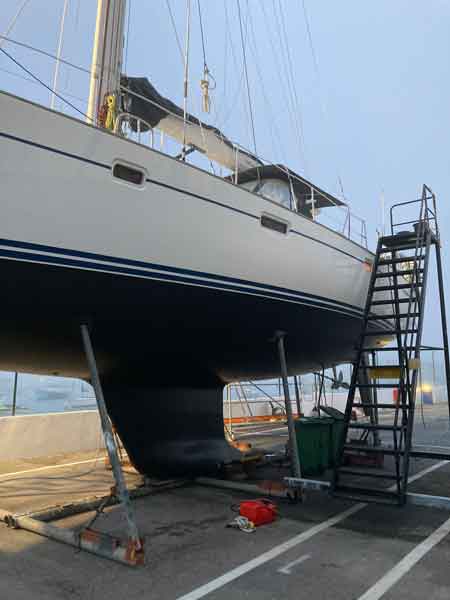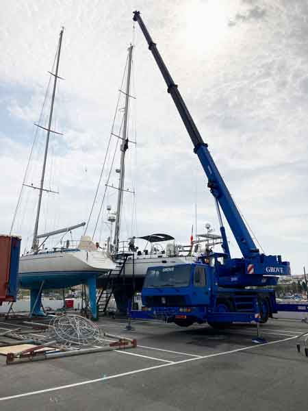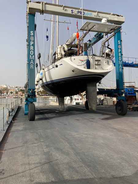 We arrived Monday at 07:30. We’ll stay at the visitors pontoon till Tuesday morning. At 10 am we’re scheduled to be hauled out at Sopromar’s. All that’s going according to plan, an hour or so later we are on shore.