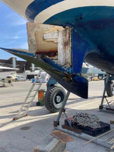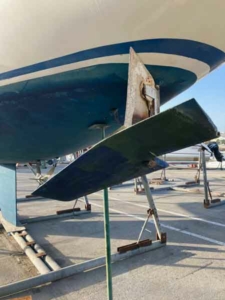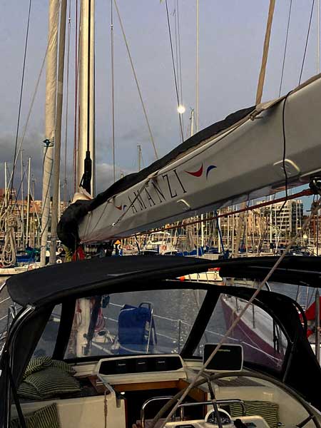 in an Orca incident just a Nm or so out Lagos and had just been hauled out. On our way to Amanzi we walked by the crane and saw the result: the rudder was horizontal and a total loss. Hopefully the fittings are still okay and watertight. Later that day, we heard of second incident also just a few miles offshore. Well, I guess that’s one advantage of being on the hard, …. no orca’s there :-/