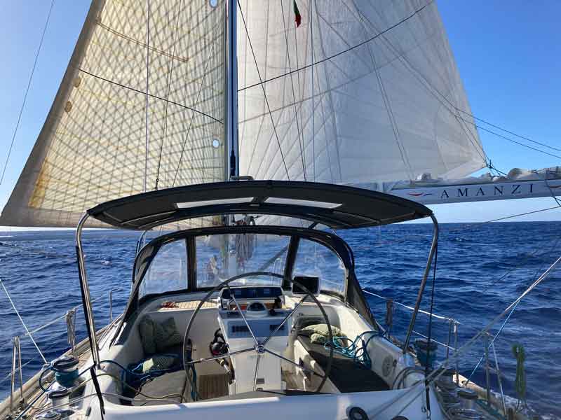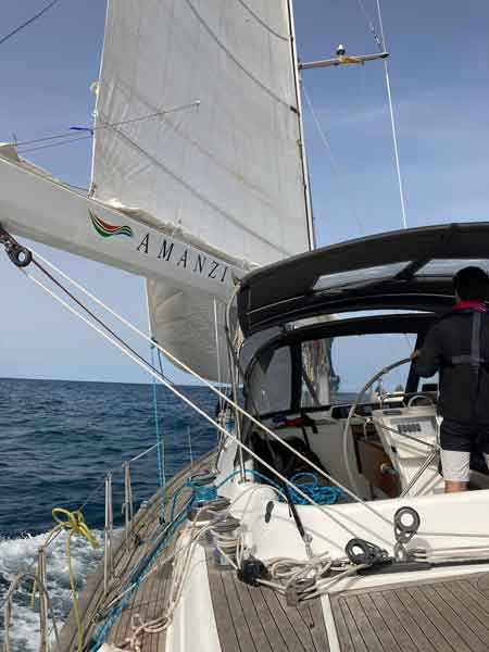 We left Lagos Tuesday at 09:00 am. The first day was a bit of a hassle to get a good sail plan. We started with very light winds motoring. Nevertheless we put the main up. Heading downwind but with the engine still running, we ran faster than the wind so the main had to be trimmed for an upwind course.