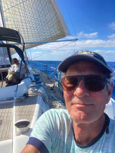 Out second day was a beautiful day, sunny and warm. We set a different sail plan: just the genoa’s and no main. The big genoa polled out by the boom, the second one on the pole. After some fiddling around with sheets, barberhauls and an extra line to fix the pole, this turned out as a very fine sailplan, comfortable, easy to reef when a squall would hit us. This could be a very nice sail plan for the crossing.