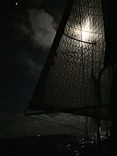 We’ll get better and quicker over time but for now we’re in no hurry and have all the sea room to practice. In the meantime, the wind has veered a bit so sometime today we will have to gybe again. Well, never a dull moment.